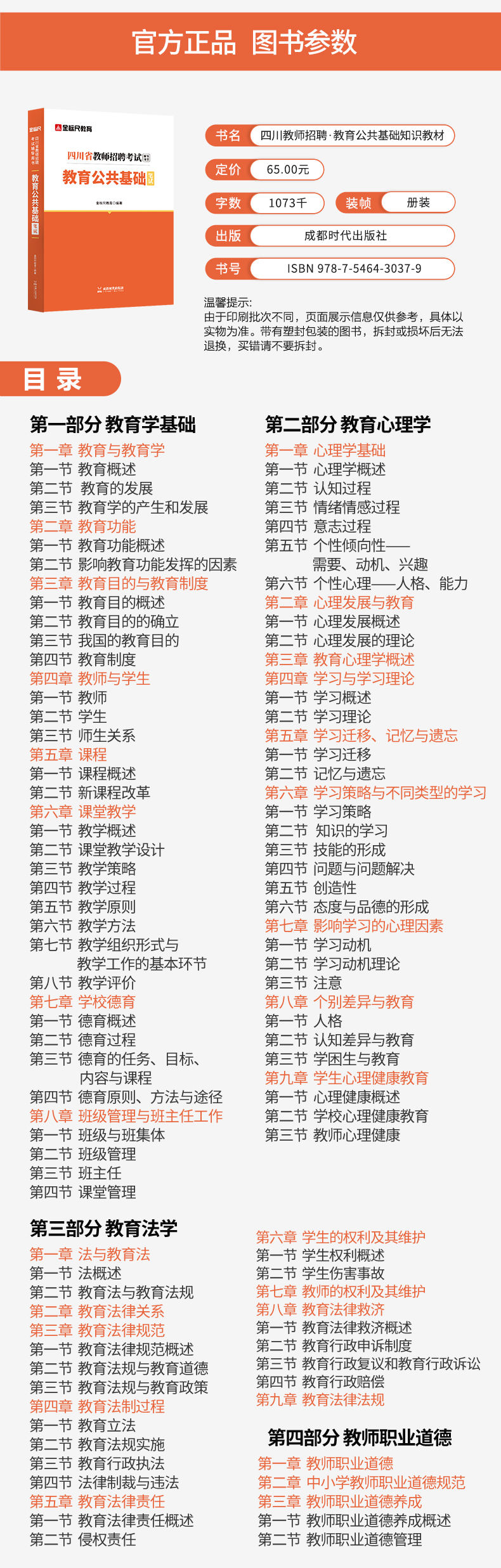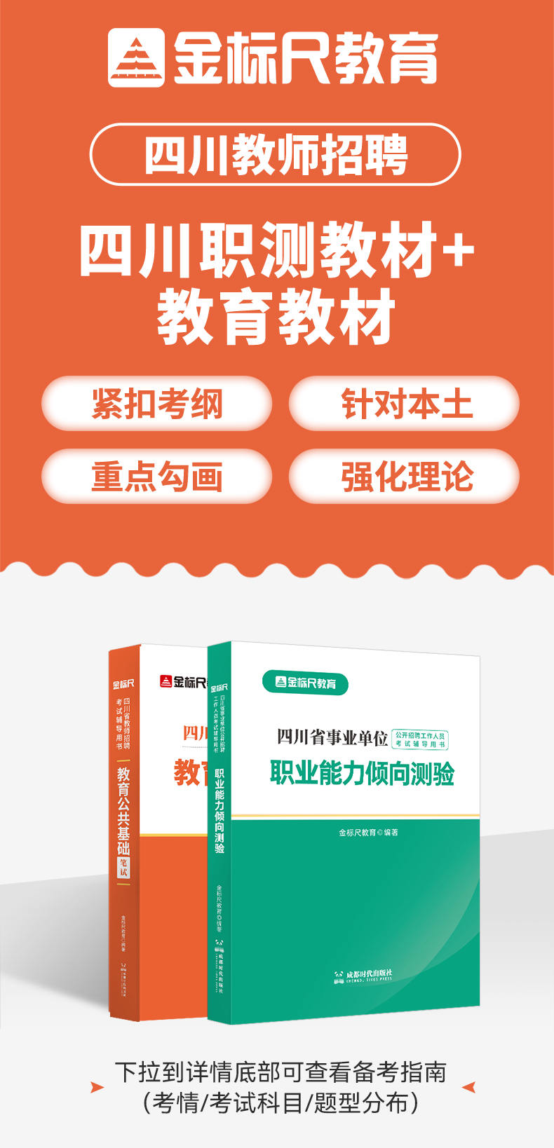 【左下角咨询客服免费领资料+免费答疑 】四川教师统考《教育公共基础》的题型和题量比较固定,主要有四种题型:判断题、单项选择题、多项选择题、案例分析题,共87题。《教育公共基础》的考试大纲规定考试内容为教育学基础、教育心理学、教育法学、教师职业道德四个部分等。 另收到书后加微信17323428165,领取电子资料:33位教育大咖,85个教育小常识,教育高频考点,四川教育进面分数,教育法律法规,《中华人民共和国教师法》(修订草案)(征求意见稿),四川教师招聘考情,每月时政热点(按月更新)等