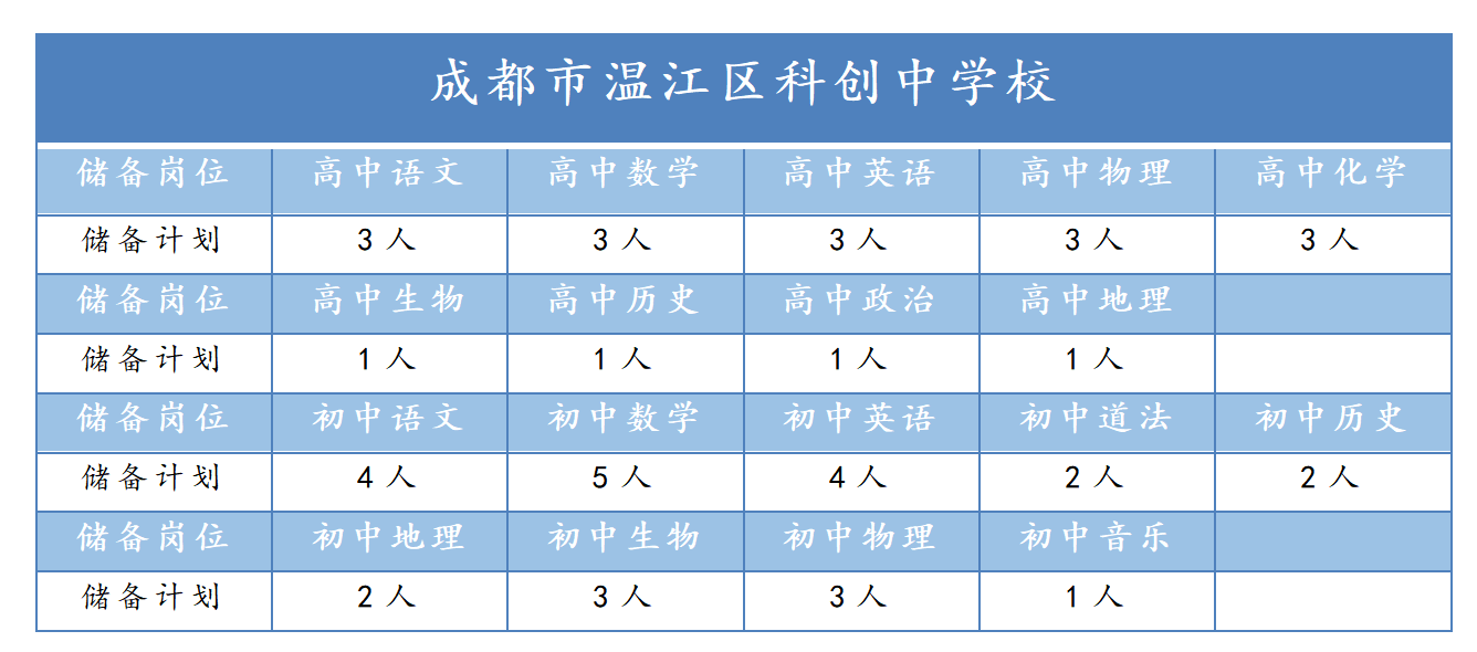 根据成都市温江区科创中学校人力资源配备实际,拟面向社会储备优秀教师,符合入编条件的教师,按相关招聘政策经考核合格后入编,现将有关事项公告如下。