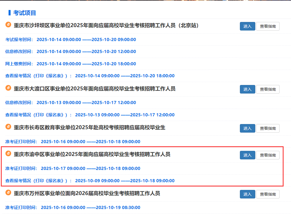 请网上报名通过的考生,于2025年10月17日9:00-10月18日9:00,登录重庆市人力资源和社会保障局官网(rlsbj.cq.gov.cn)“热点服务”—“人事考试网上报名”—“区县委托、社会化服务考试入口”—“重庆市渝中区事业单位2025年面向应届高校毕业生考核招聘工作人员”,打印准考证(使用A4纸打印,保证字迹、照片清晰)。请各位考生及时打印准考证,以免影响参加考试考核。
