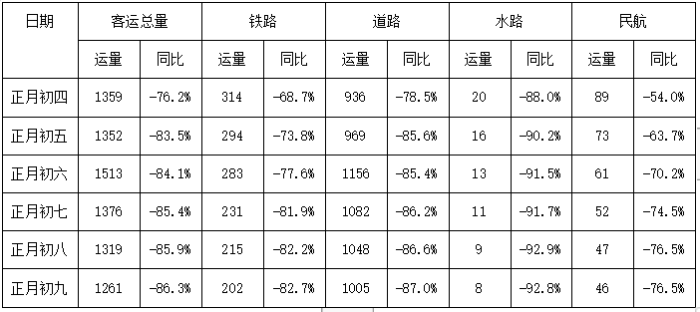 疫情管控措施发布之后,客运数据急转直下。春运前24日(腊月十六-正月初九),全国铁路、道路、水路、民航共累计发送旅客12.84亿人次,比去年同期下降27.5%。其中铁路发送旅客1.93亿人次,下降18.0%;道路发送旅客10.41亿人次,下降29.0%;水路发送旅客1602.2万人次,下降39.4%;民航发送旅客3482.0万人次,下降20.0%。在通常的出行和返程高峰时期(正月初四及之后若干天),疫情对全国客运的影响尤为明显,从正月初五至正月初九连续五天全国客运总量同比减少超过80%。