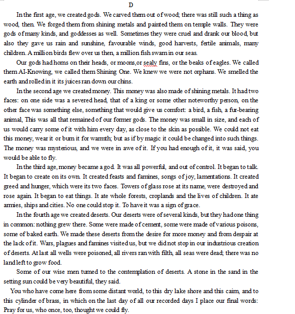 In the first age, we created gods. We carved them out of wood; there was still such a thing as wood, then. We forged them from shining metals and painted them on temple walls. They were gods of many kinds, and goddesses as well. Sometimes they were cruel and drank our blood, but also they gave us rain and sunshine, favourable winds, good harvests, fertile animals, many children. A million birds flew over us then, a million fish swam in our seas.