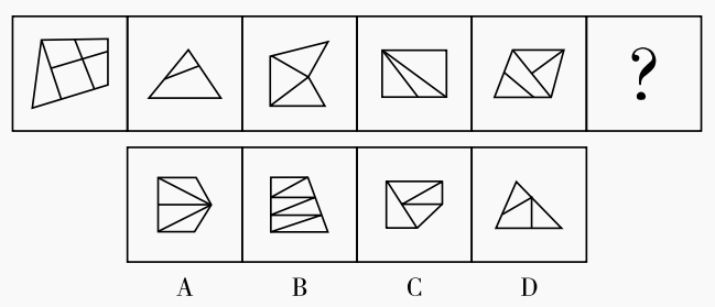 图形凌乱,优先考虑数量类规律。元素、笔画数均不存在规律,依次考虑面、线、点、角的数量。题干图形总的面数量为5、2、3、3、4,不存在明显规律,继续考虑面的细分考点,题干图形均存在特定面三角形,故可考虑三角形面的数量。观察发现,大三角形面的数量分别为1、2、3、4、5、?,数量依次递增,所以?处应选择大三角形数量为6的图形,选项中各图形大三角形数量分别为5、6、4、3,仅B项符合。故本题答案为B项。