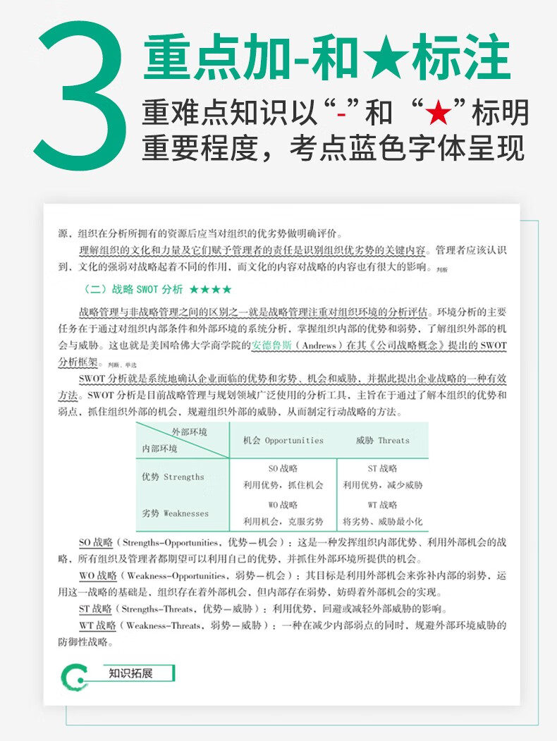 【左下角咨询客服免费领资料+免费答疑 】购书后加微信17725093951 领取备考视频讲解高频考点,决策方法,幅度与层次,组织结构,激励理论等 ①双色印刷,考点、框架用蓝色标注 ②新增知识拓展和真题链接 ③重点知识有划横线标注 更多咨询可以加微信17323428165