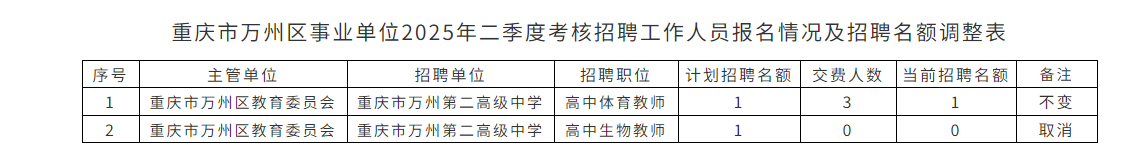 关于重庆市万州区事业单位2025年二季度考核招聘工作人员报名情况及因报名不足调整招聘名额的公告 最后两套卷,1:1复刻,文字+视频双解析 按照2025年5月19日发布的《重庆市区县事业单位2025年第二季度考核招聘工作人员公告》中“未达到开考比例情形的处理”有关规定,根据各岗位报名情况、岗位需求及人才紧缺程度,经用人单位及主管部门研究,并报市级事业单位人事综合管理部门备案,现公布报名情况及因报名不足调整招聘名额情况(详见附件)。 附件:重庆市万州区事业单位2025年二季度考核招聘工作人员报名情况及招聘名额调整表 最后两套卷,1:1复刻,文字+视频双解析 关于重庆市万州区事业单位2025年二季度考核招聘工作人员报名情况及因报名不足调整招聘名额的公告 *消息来自万州人民政府权威发布 金标尺教师团队整理 关注更多教招信息:【重庆教师金标尺】公众号 海量题库丨岗位匹配丨干货资料丨在线答疑