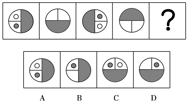 移动。图形组成相同,考虑位置类规律。观察发现,题干图形中灰色半圆依次顺时针移动一格,白色小圆与灰色小圆依次逆时针移动一格,当位置重合时,白色小圆与灰色小圆被灰色半圆遮挡,据此规律,只有 A 项符合。故本题答案为 A 项。