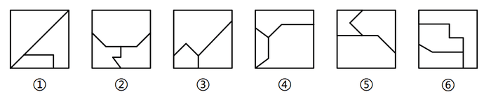 图形组成凌乱,考虑数量类规律。元素、笔画数均无规律,可按面线点角的顺序考虑。在数面的时候发现,题干各图形均有三个面,明显存在最大面和最小面,且均明显对称,可以考虑最大面和最小面的对称性。观察发现,图①②⑥中的最大面均为轴对称图形,图③④⑤中的最小面均为轴对称图形,据此规律,可将图形分为两组。