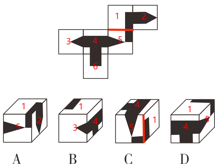 C项,该项正面为面5、右侧面为面1、顶面为面4,且面1内的矩形长边紧靠面1和面5的公共边,而在展开图中为短边紧靠公共边,位置关系错误,不能折叠,当选;