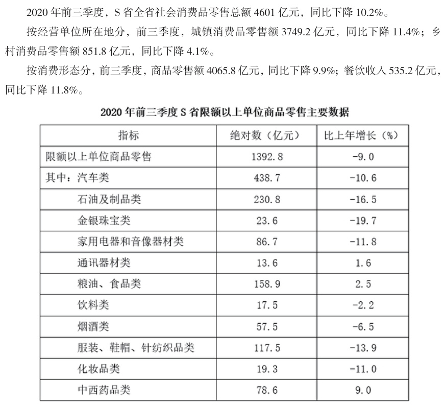 2020年前三季度,S 省全省社会消费品零售总额4601亿元,同比下降10.2%。