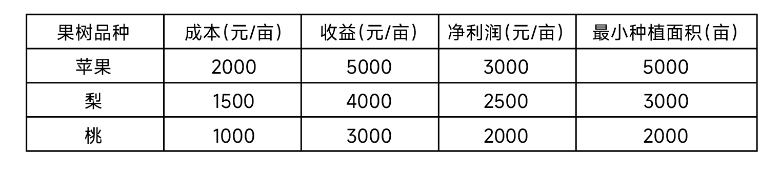 某山区现有2万亩土地,计划发展“果树经济”,可选果树品种为苹果、梨、桃,三者的核心参数如下表: